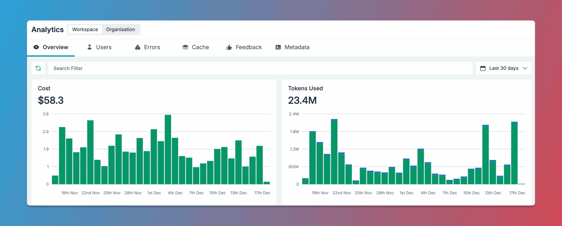 Monitor analytics and logs across all workspaces in your organization through a unified dashboard. This centralized view provides comprehensive insights into cost, performance, and accuracy metrics for your deployed AI applications.