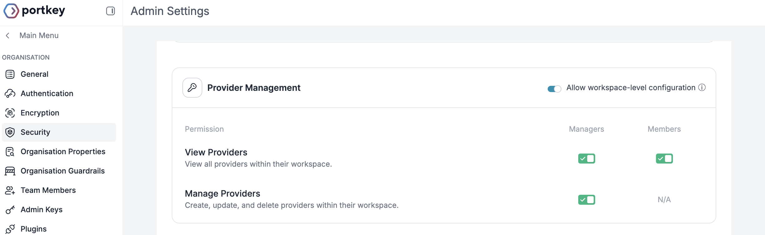 The Provider Management section includes a toggle for Allow workspace-level configuration and provides granular permission controls for different user roles: